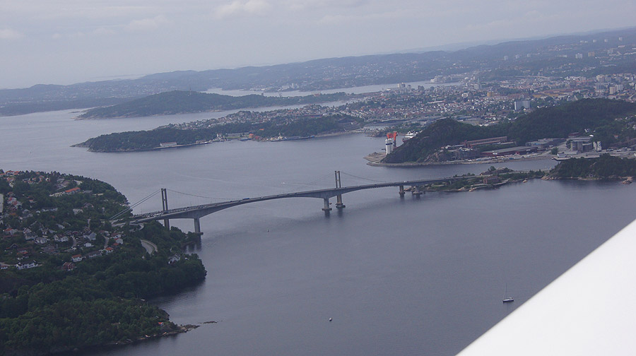 Nach dem letzten Pflichtmeldepunkt im Abflug von Bergen haben wir mehrere Fjorde passiert. Darunter war auch der Hardangerfjord, welcher der zweitlängste Fjord Norwegens ist. Wir gaben dann die Koordinaten des Predigtstuhls in unser Navigationsgerät ein. Die sehr imposante Felskanzel fällt über 600 Meter senkrecht in den Lysefjord ab. Sie ist ein sehr beliebter Ausflugsbalkon am Ende eines 1 ½ stündigen Wanderweges für den ca. 40 km langen Lysefjord. Ich kann nicht sagen, ob wir aus dem Flugzeug mehr Bilder von dieser Aussichtsplattform gemacht haben oder ob mehr Bilder von uns gemacht wurden. Da das Wetter eher bescheiden war und keine große Arbeitshöhe zuließ, sind wir dann mehr oder weniger der Südküste Norwegens bis nach Kristiansand entlang geflogen.
