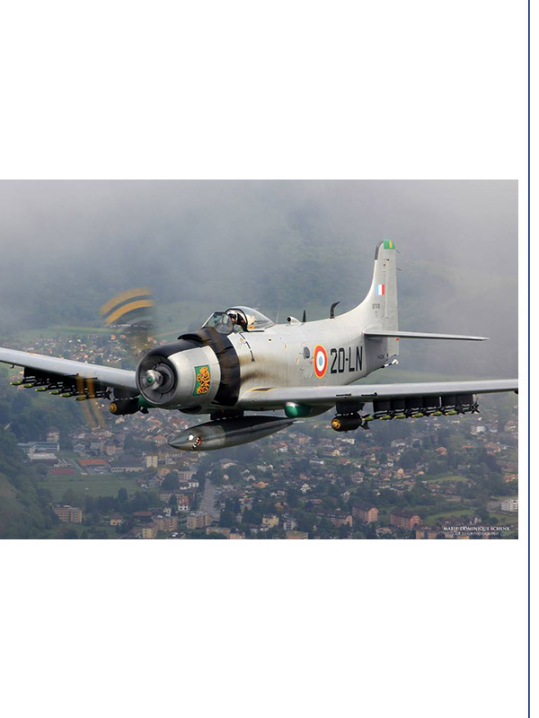 Aircraft ground attack American construction in service during the Vietnam War until 1975. Specializing in the attack point target and support for recovering pilots ejected into enemy territory. It can carry the equivalent of its own weight in very different weapons. It can carry the equivalent load of 2 Boeing B17 Superfortress.The plane shown is the only warbird approved in Europe to fly with its full complement of 12 rockets, two bombs and a ventral fuel tank.