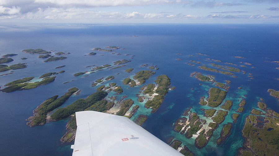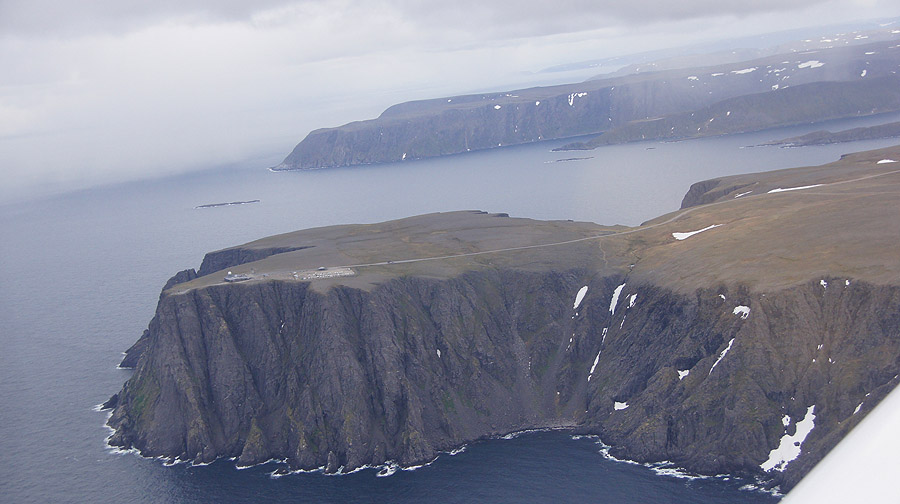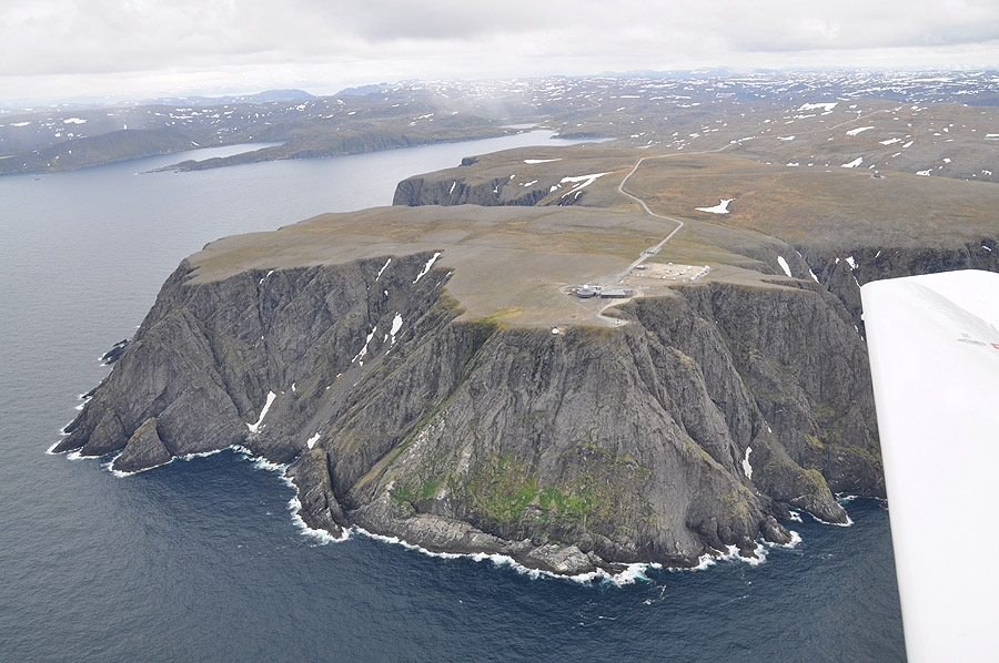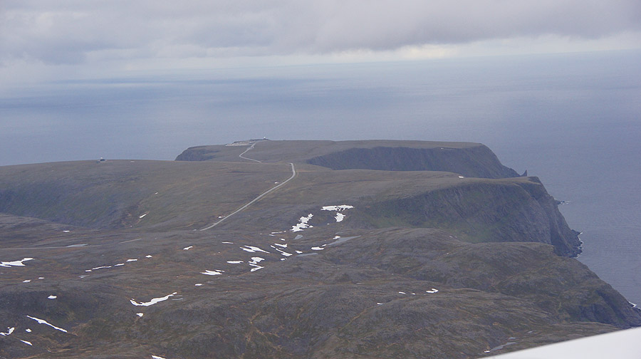Nach etwas mehr als 2 ½ Flugstunden in Hammerfest angekommen, stellten wir fest, dass unser Otto zwar vor acht Jahren hier seinen Sprit bekommen hat, dies für uns aber heute nicht mehr galt. Die Fluglotsen verzichteten für den kurzen Flug zum Tanken nach Lakselv-Banak, Europas nördlichstem Festlandflugplatz, auf einen Flugplan. In Lakselv-Banak lief wieder alles problemlos ab. Hier bekam jeder von uns ein kleines Abzeichen für das Erreichen des nördlichsten Festlandsflugplatzes in Europa. Auch hier verzichteten die Fluglotsen für den kurzen Flug zur Nordkapinsel Honningsvåg auf einen Flugplan. Die Landschaft zum Nordkap ist schon recht karg und unbebaut. Die Existenz von Landwirtschaft konnten wir spätestens ab dem Polarkreis nicht mehr feststellen. Über längere Zeit waren auch weder Straßen, Stromleitungen noch sonstige Hinweise auf menschliche Existenz sichtbar. Selbst auf den Gewässern waren keine Schiffe unterwegs, was bei null Grad Celsius eigentlich auch nicht verwunderlich ist.