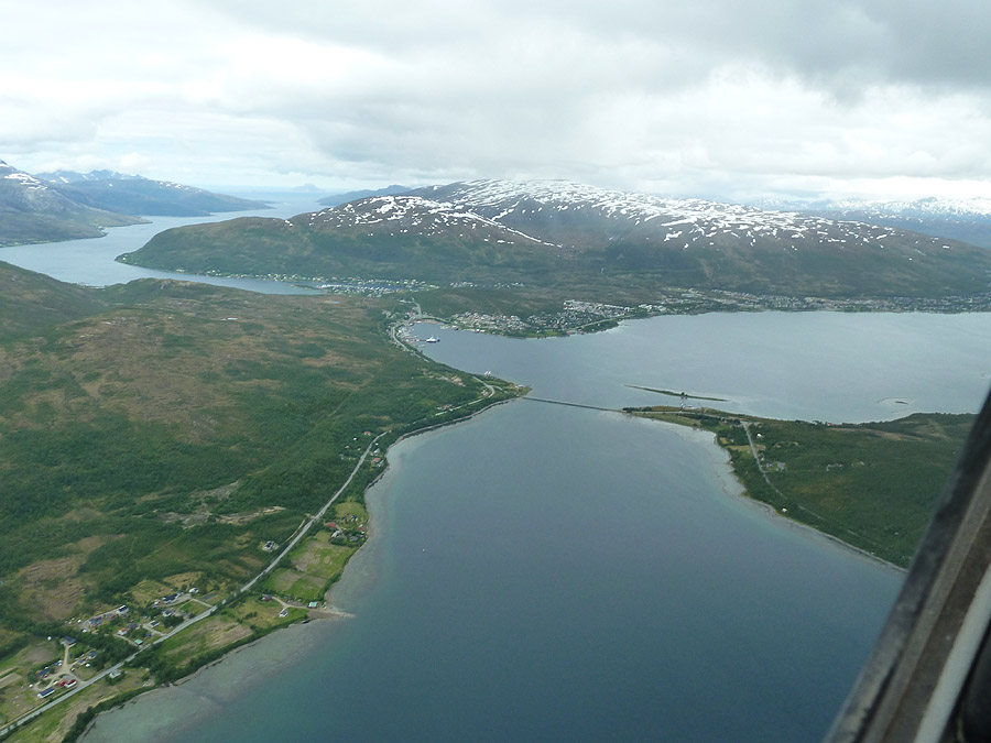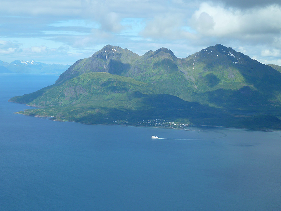 Von Bodø ging es über den Ofotfjord bei Narvik und durch den 50 km langen Tjeldsund weiter nach Norden. Der Tjeldsund war schon vor 1.000 Jahren eine bei den Wikingern bekannte Wasserstraße in Norwegen. Auch für uns war diese Wasserstraße wie geschaffen, da wir unter den Wolken den um uns herumliegenden Bergen ausweichen mussten. Anschließend kam die Insel Senja in Sicht. Sie ist die zweitgrößte Insel Norwegens mit dem Ånderdalen-Nationalpark. Die Landschaft ist geprägt von scharfkantigen Bergen, zahlreichen Seen und Bächen.