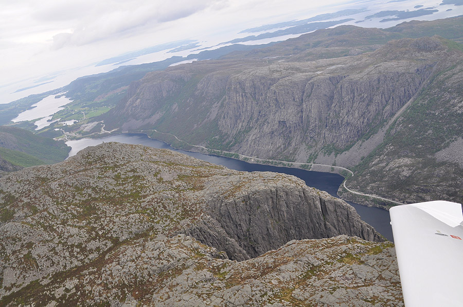 Von Kristiansand sind wir bei sonnigem Wetter mit angelegten Schwimmwesten direkt an die nordwestlichste Küste von Dänemark geflogen und dann weiter der Küstenlinie folgend bis nach Hamburg. In Hamburg sind wir auf Anraten eines Fluglotsen kurzfristig gelandet, da ein direkter Anflug nach Rinteln durch eine Gewitterfront verhindert wurde. Nach der Landung blieben wir wegen des Starkregens noch 20 Minuten im Flieger sitzen. Nach einer Stunde konnten wir dann wieder bei schönstem Wetter den Flug nach Rinteln fortsetzen. Bergen Tysdalsvatnet Norwegen Preikestolen in Bildmitte