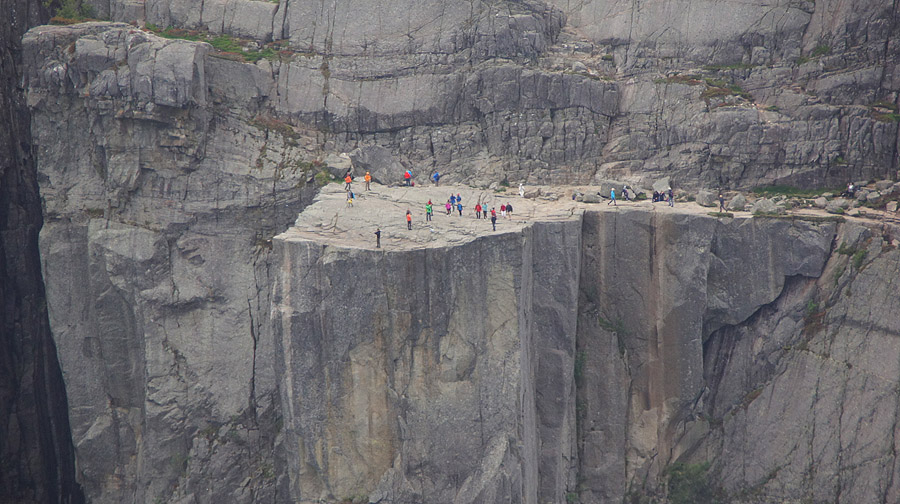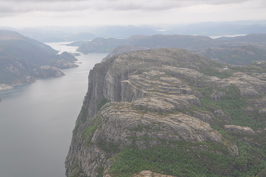 Nach dem letzten Pflichtmeldepunkt im Abflug von Bergen haben wir mehrere Fjorde passiert. Darunter war auch der Hardangerfjord, welcher der zweitlängste Fjord Norwegens ist. Wir gaben dann die Koordinaten des Predigtstuhls in unser Navigationsgerät ein. Die sehr imposante Felskanzel fällt über 600 Meter senkrecht in den Lysefjord ab. Sie ist ein sehr beliebter Ausflugsbalkon am Ende eines 1 ½ stündigen Wanderweges für den ca. 40 km langen Lysefjord. Ich kann nicht sagen, ob wir aus dem Flugzeug mehr Bilder von dieser Aussichtsplattform gemacht haben oder ob mehr Bilder von uns gemacht wurden. Da das Wetter eher bescheiden war und keine große Arbeitshöhe zuließ, sind wir dann mehr oder weniger der Südküste Norwegens bis nach Kristiansand entlang geflogen.