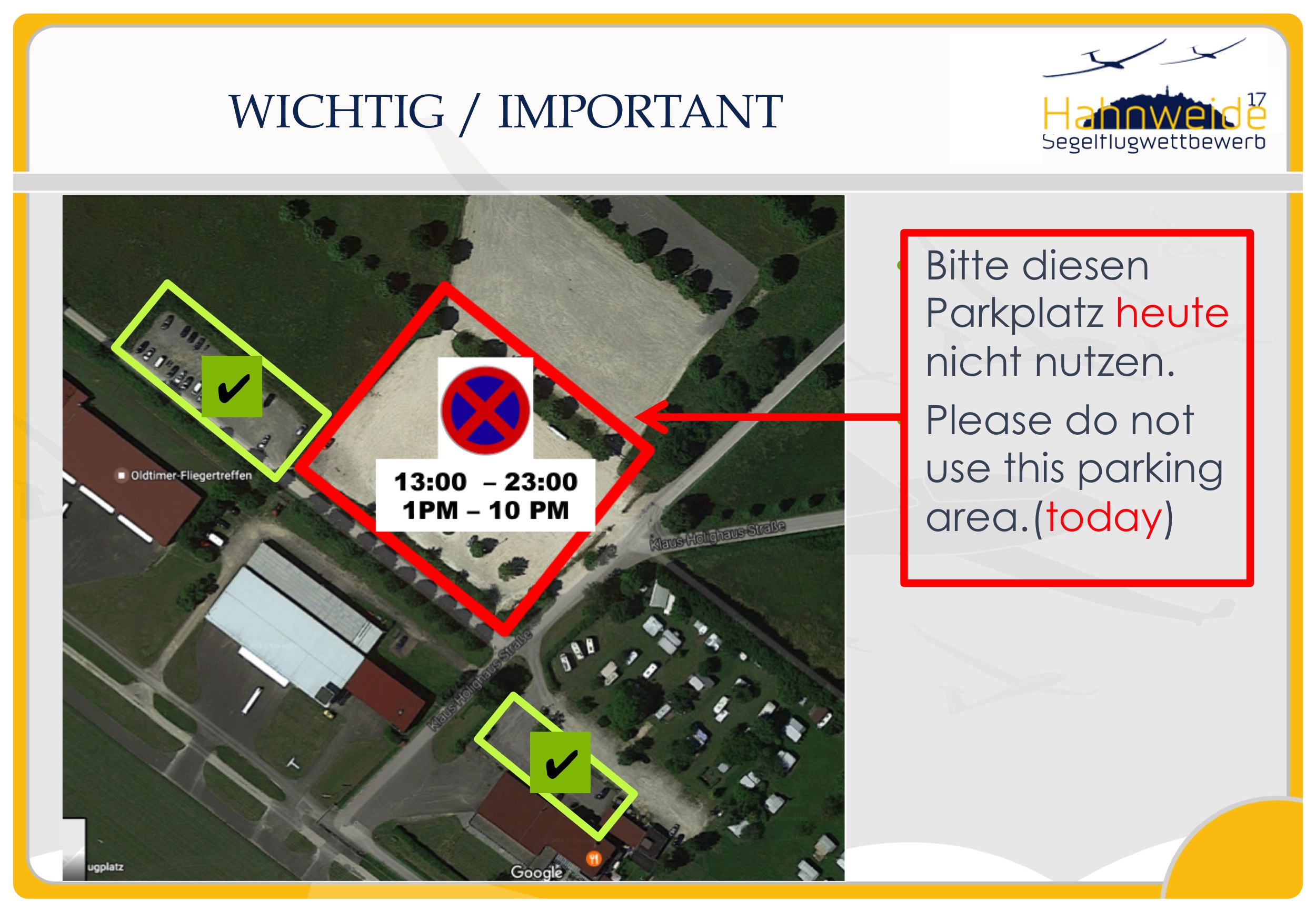 Von 13 - 23 Uhr wird dieser Parkplatz gewerblich benutzt und steht uns nicht zur Verfügung. Vielen Dank!