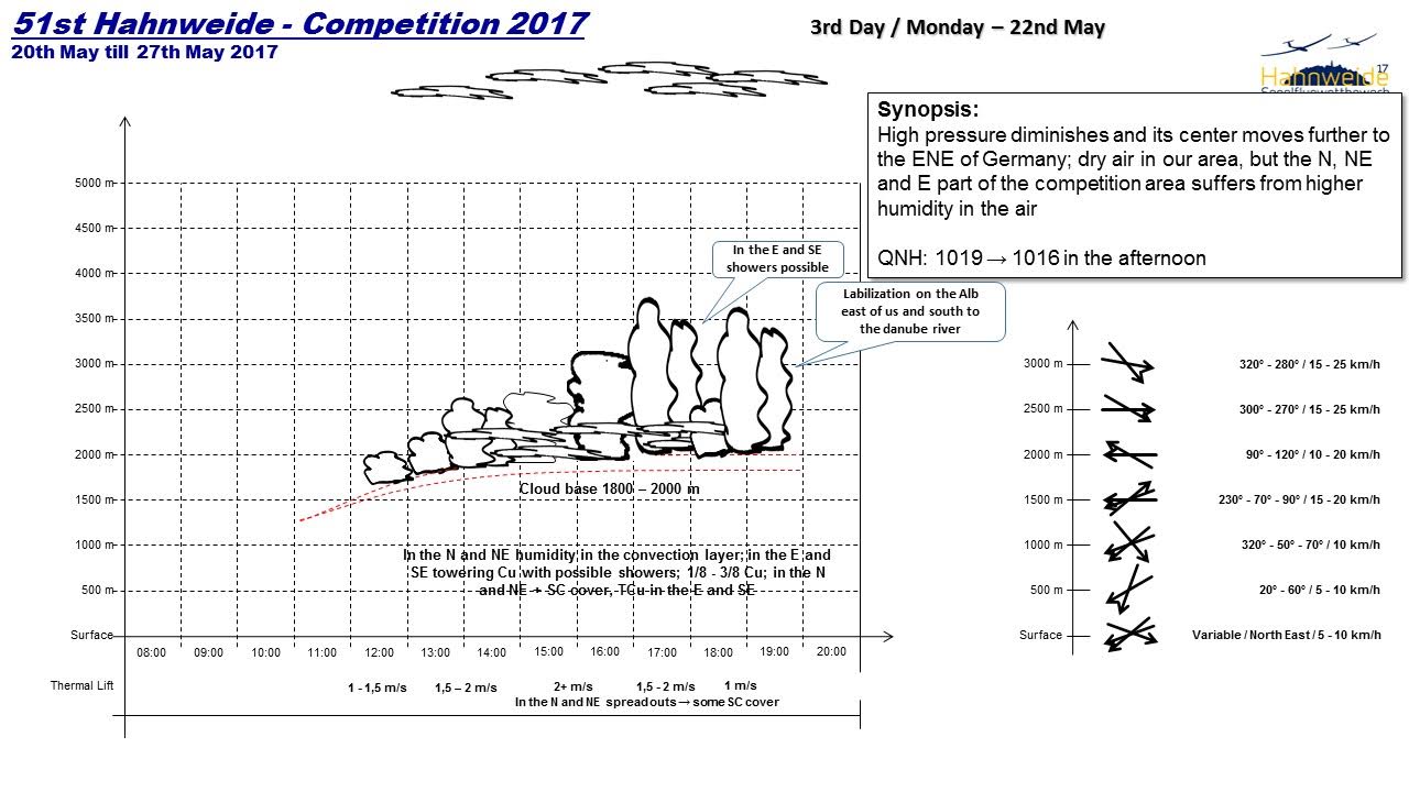 Kurz zum Wetter: Unser Wettbewerbsraum liegt weiterhin unter Hochdruckeinfluss. Im Osten befindet sich jedoch eine feuchte Luftmasse, während es im Westen recht trocken ist. Die Basis wird am Nachmittag bis auf 2000m ansteigen, Steigwerte um 2m/s, stellenweise auch 2.5m/s werden erwartet.