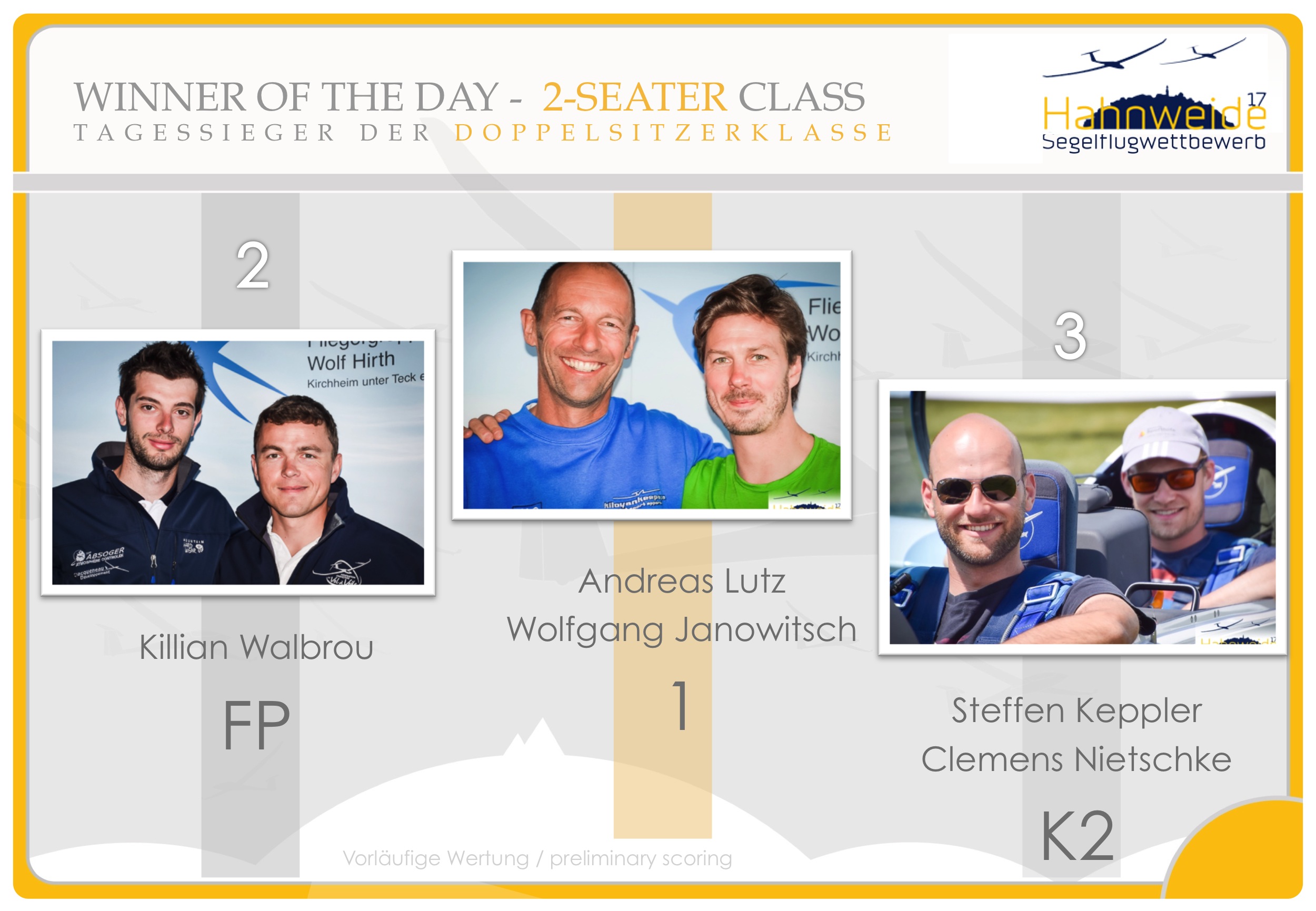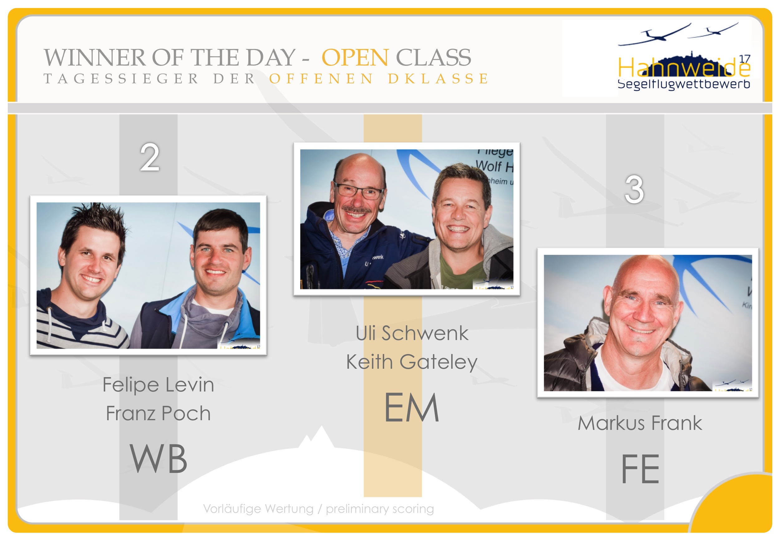 Von daher sind wieder alle Tagesaufgaben Richtung Osten / Nordosten ausgeschrieben. Die Piloten haben auch eine alternative B-Aufgabe erhalten, die etwas kürzer ist. Je nach Wetterentwicklung wird kurzfristig entschieden, was geflogen wird. Alle Tagesaufgaben bewegen sich zwischen 260 und 360km. Vorwiegend als Strecke um drei Wendepunkte