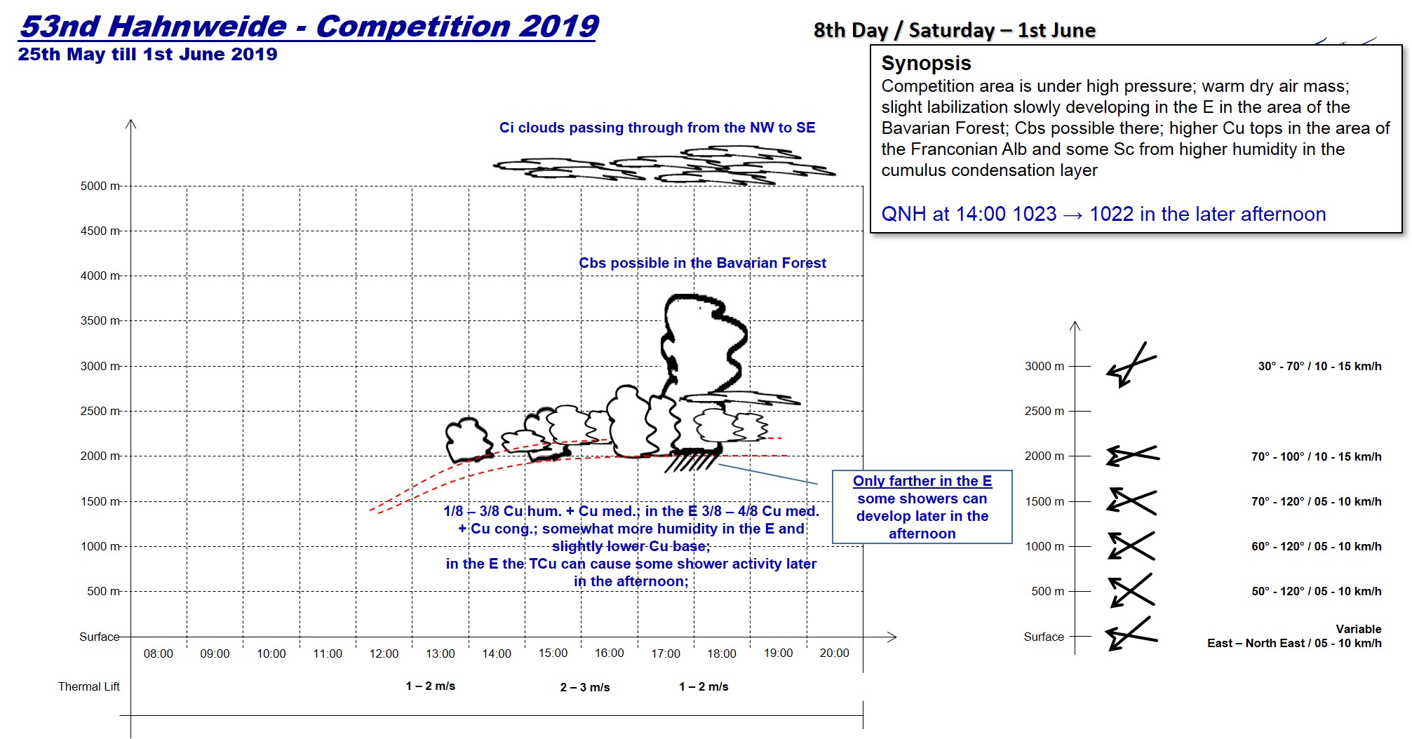 Wer glaubt, dass am letzten Wertungstag nur kurze Aufgaben ausgeschrieben werden, der wird heute des Besseren belehrt. Die kleinste Strecke hat die Standardklasse mit rund 400km. Auch die 15m Klasse fliegt eine Racing Aufgabe. 18m, Doppelsitzer und Offene Klasse haben AAT's. Die längst Mindestflugzeit beträgt heute 4:30h!