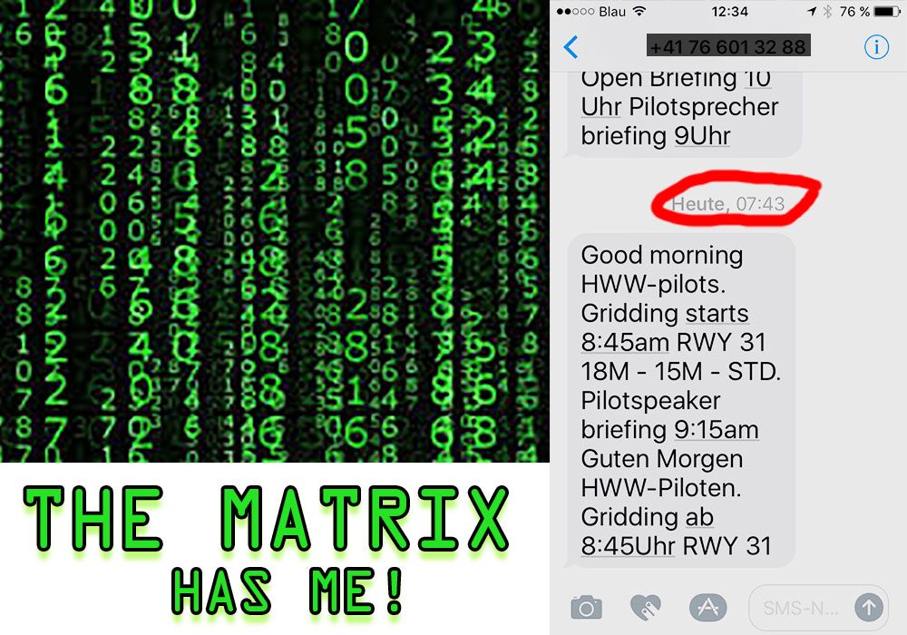 Ihr erinnert Euch noch an die Worte im Matrix Film: „Zeit ist nur ein Illusion“? Nun, zur gleichen Uhrzeit, als die Piloten heute Morgen die SMS zum Startaufbau erhalten habt, habe ich eine SMS aus der VERGANGENHEIT erhalten... Lt. der erhaltenen Nachricht (ursprünglich von vorgestern) fliegen heute nur 3 Klassen...(Ich bin übrigens im gleichen Verteiler!!) Aber schaut selbst... Es kann mir niemand erklären, wie das passieren konnte... und ich habe bis jetzt noch nicht die tagesaktuelle SMS erhalten... Ich hoffe sehr, morgen früh wieder in der echten Welt aufzuwachen ;-)