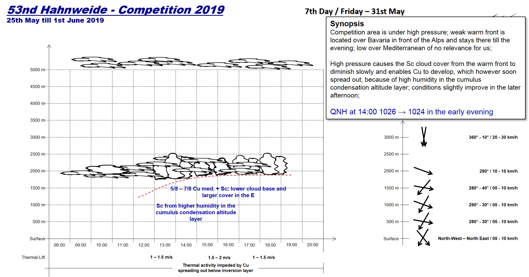 So, after today's confusion about my grid information - sorry again - now let's have a look to the weather. Meteorologist Jupp Dahlem was not really optimistic today because of thermal conditions. That's the reason why we are going to fly only small tasks. Standard and 15 m class got a two hours AAT. The other three classes will fly racing tasks. First launch will be expected not before 12:00.