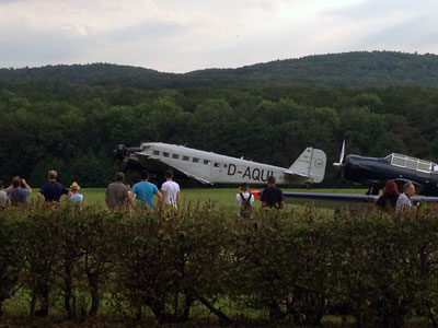Die Lufthansa Ju 52 macht sich gerade bereit zum Start auf der Piste 31. Dazu muss das große Flugzeug über die Piste zum Startpunk rollen. Die Anfliegenden Flugzeuge müssen sich deshalb etwas südlich des Platzes im "Holding" aufhalten.