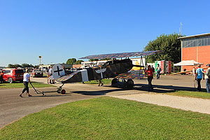 schwitzt er mit Unterstützung von Dieter Gehling (J) beim Aufbau der Fokker D VII. Die sieht gewaltig aus, ihr werdet begeistert sein!!! Hinten in der Backseinhalle stehen die Teile der Fokker DR 1 die morgen dann vom Team um Biggi Koch aufgebaut wird. Als nächstes kam Andreas Bucher mit der Staggerwing an, willkommen auf der Hahnweide.Robbie Laub hat seine HA-NSG bereits auch auf HAWEI abgestellt! Im Gegensatz zu HAWAI gibt’s inzwischen auf HAWEI aber schon ein kühles Bier. Unsere Frau Eberhard-Klink mit ihrem Team haben schon die Zapfhähne angeschlossen. Das gleich gilt auch für unsere Freunde von der FG Köngen-Neckartal! Walter Eichhorn ist inzwischen nicht nur mit der T6 da (mit der er schon den Hochzeitsflug mit seiner Frau gemacht), deshalb behält er sie, ich meine die Frau und das Flugzeug J!, sondern hat heute morgen auch die EXTRA geholt! Unsre Freunde aus Ungarn sind ebenfalls eingetroffen und bauen vor der Halle die Polkarpov Po2 auf!