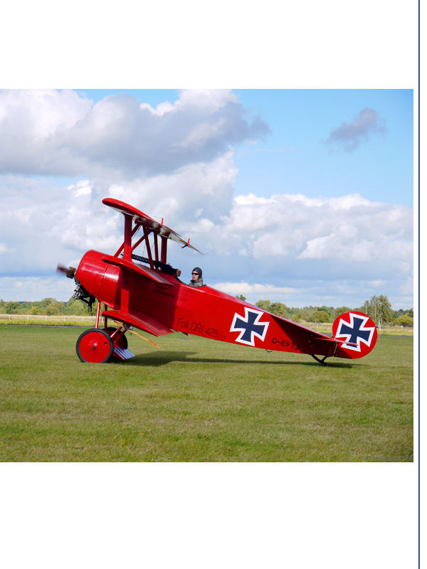 Eines der berühmtesten Jagdflugzeuge des ersten Weltkriegs wurdeder Fokker DR I „Dreidecker“. Der Dreidecker wurde als Antwort auf den britischen Sopwith Dreidecker vondem Niederländer Antony Fokker 1916/1917 in Schwerin entwickelt.Es wurden ca. 350 Stück gebaut, welche zahlenmäßig im Krieg aber nur eineuntergeordnete Rollen spielten.Freiherr Manfred von Richthofen war der wohl berühmteste Pilot diesesFlugzeuges, obwohl auch viele andere deutsche Fliegerasse mit demDreidecker in der Luft kämpften.Durch seinen lange mysteriösen Abschuss am 21.April 1918 nach einemspektakulären Luftkampf, wurden Manfred von Richthofen und sein roterDreidecker zur Legende vom „ Roten Baron“ oder dem „red devil“ wie ihn dieAlliierten vorher schon nannten.Der DR I war ursprünglich mit einem Oberursel Umlaufmotor mit 110 PSausgerüstet.Unsere Fokker, eine Replika wurde von Josef Koch von April bis Oktober 1988, nach alten Plänen der Fokker Werke gebaut. Unterstützt wurde er dabei von der Firma Bitz, Augsburg, welche schon für den Film „ Der blaue Max“zwei Dreidecker gebaut hatte.Der Erstflug unserer Fokker fand am 07.03.1989 in Augsburg statt.Er ist mit einem Siemens SH 14 mit 145 PS Motor bestückt.Die Bemalung ist so gehalten, wie ihn der Rote Baron im Sommer 1917 an derFranzösischen Front flog, und ist deshalb auch mit der Werknummer 425/17am Rumpf versehen.