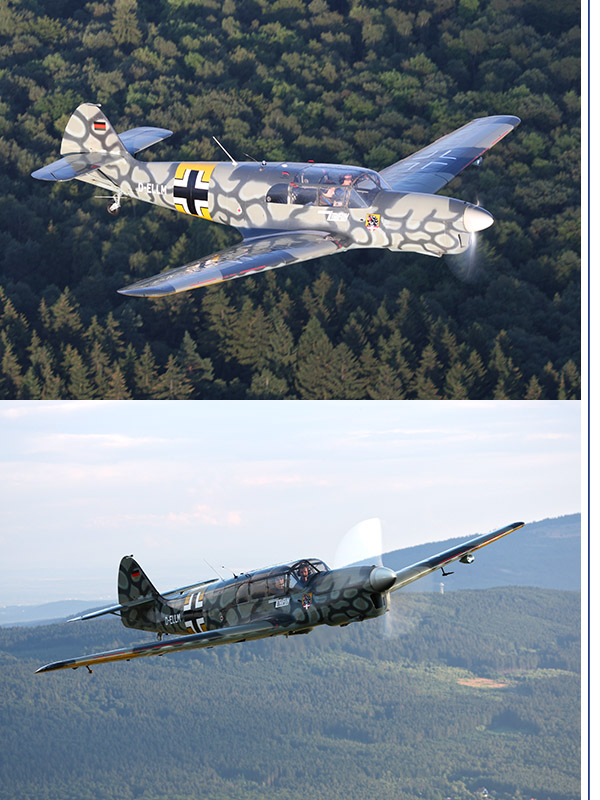 Nord 1002 (Me 108 D)Hersteller: Messerschmitt und Société Nationale de Constructions Aéronautiques du Nord (SNCAN), ParisBaujahr: 1945SNCAN baute die Me 108D bis 1945 für das Deutsche Reich und rüstete nach dem Krieg diese Flugzeuge für den Eigenbedarf der französischen Armée de l'Air auf Renault-Motor um. Diese Nord 1002 ist das einzige zum Verkehr zugelassene Flugzeug dieses Typs in Deutschland und eines der wenigen auf der Welt, das noch fliegt.Motor: Renault 6Q10 mit 230 PSReisegeschwindigkeit: 260 km/hReichweite: 900 km