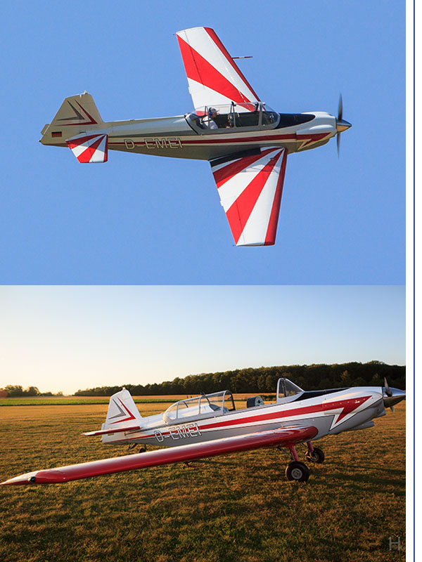 Die EMEI ist einer der letzten (wenn nicht die letzte) fliegende Zlin 526L. Idee bei der Entwicklung der \\\"L\\\" war wohl, die Export-Chancen für das sehr erfolgreiche Muster Zlin 526 Trener dadurch zu erhöhen, dass man einen amerikanischen \\\"Standardmotor\\\" verwendet. Der Trockensumpf Aerobatikmotor (davon gab\\\'s auch nicht viele, das Trockensumpfkonzept wurde von Lycoming kurze Zeit später aufgegeben) wurde anstelle des M337 integriert. Da der Motor andersherum dreht wie das originale Triebwerk, ist er \\\"schief\\\" eingebaut und im Kunstflug (Turn) verhält sich das Flugzeug dann auch anders als eine \\\"normale\\\" Zlin.Das Flugzeug wurde von 2008 bis Frühjahr 2012 komplett grundüberholt.