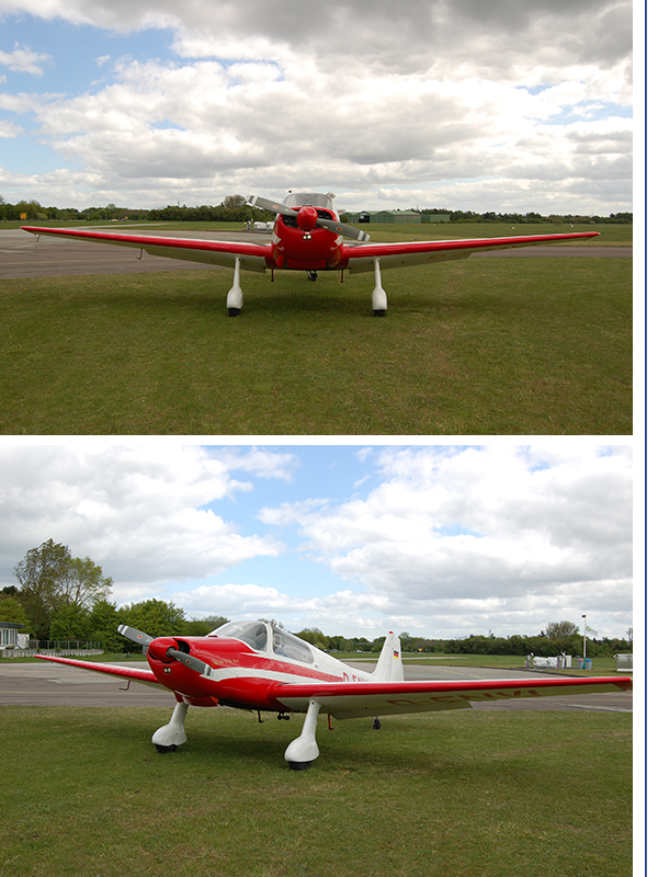 BÖLKOW 207 TBaujahr 1963, 4- Sitzig, KunstflugtauglichTiefdecker mit festem SpornradfahrwerkHöchstzul. Fluggewicht: 1200 KgMotor: Lycoming O-360 A1A Vierzyl. 180 PSVerstellpropellerHöchstgeschwindigkeit: 340 Km/hReisegeschwindigkeit: 235 Km/hDienstgipfelhöhe: 4300 mReichweite: 1250 KmKompositbauweise (Hauptbaustoff ist Holz, mit Verkleidungsteilen aus Kunstoff)Die Entwicklung des Flugzeugs stammt von Hans Klemm aus den 30er Jahren