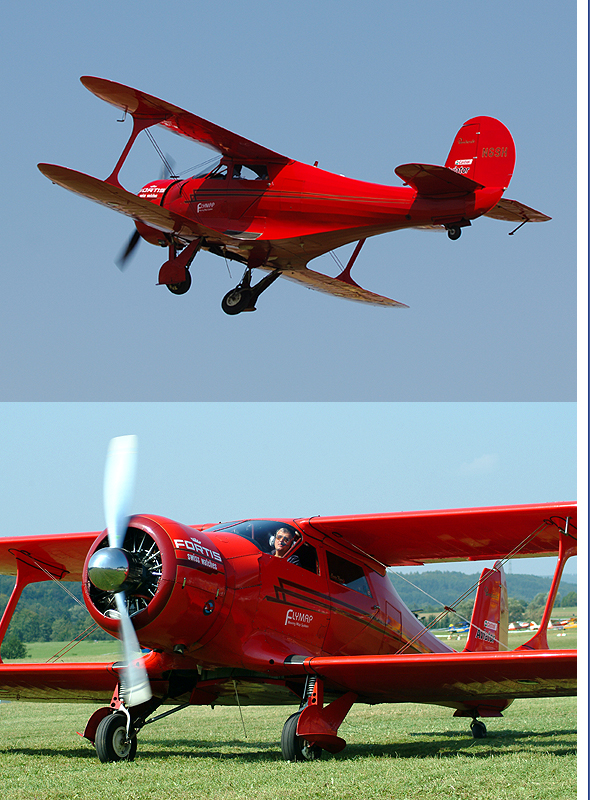 Baujahr:Mai 1943 Kennung : N69H Muster: D17 S „Staggerwing“Hersteller: Beech Aircraft Corporation, Wichita KansasMotor: Pratt & Whitney SB Wasp-Junior R 985 9-Zylinder Sternmotor mit TurboLeistung: 450 PS bei 2300 RPM 16,5 Liter HubraumSitzplaetze: 1 + 3Damaliger Listenpreis: Juli 1938 17790,- $-DollarTragwerkEinstieliger, verspannter, negativ gestaffelter Doppeldecker; zwei Holzholme;Stoffbespannung; Flügelnasen mit Duralumin beplankt;Querruder an den Oberflügeln; elektrisch betätigte Landeklappen an den Unterflügeln.Rumpf Stahlrohrbauweise; blechbeplankt u. stoffbespannt.LeitwerkNormalbauweise freitragend; Flossen in Ganzholzbauweise; Ruder in Stahlrohrbauweise stoffbespannt; Trimmklappen.Elektrisches Einzieh-FahrwerkDämpfung ölpneumatisch, hydraulische Bremsen; SpornradDie Beech bekam den Spitznamen Staggerwing, nachdem auf einer Luftfahrtschau ein Sprecher über die gestufte Anordnung der Tragflächen berichtete (engl. Stagger). Tatsächlich sind die Tragflächen bei diesem Typ anders als bei den meisten Doppeldeckern angeordnet: Die untere Fläche liegt vor der oberen Fläche. Das gibt der Maschine ihr unverwechselbares elegantes Aussehen. Außerdem sorgt es dafür, dass man die Maschine nicht überziehen kann; es kommt nie an beiden Flächen zum Strömungsabriss.Die Staggerwing war der „Learjet der Vorkriegszeit“ und wurde von vielen Unternehmen zum Transport ihrer Führungskräfte verwendet. Sie wurde auch als Rolls Royce bezeichnet. Im zweiten Weltkrieg wurde die Staggerwing auch von der British Royal Airforce eingesetzt. Die 106 gelieferten Maschinen bekamen den Namen Traveller.