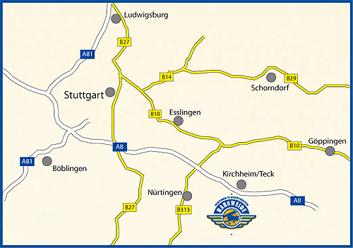 Motorway ('Autobahn') A8 Stuttgart-Munich, approx. 30kmsouth-east of Stuttgart, exit 56 'Kirchheim-West' direction 'Nürtingen', after 500m turn left following sign 'Segelfluggelände Hahnweide'. Approach roads will be marked by special signs. We expect a strong afflux of visitors so why don't you use our free bus shuttles running off from and to Kirchheim/city? The bus stops will have special markings.