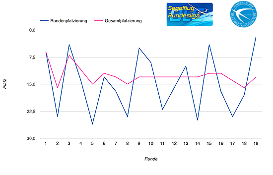 In Runde 13 war nur der Samstag fliegbar. 4 Punkte und Rundenplatz 17 stehen auf unserer Ergebnisliste. Bei noch verbleibenden 6 Runden stehen wir momentan auf Platz 13 mit 100 Punkten. Blickt man ein Jahr zurück, standen wir dort mit 49 Punkten und Platz 25 deutlich schlechter da. |
